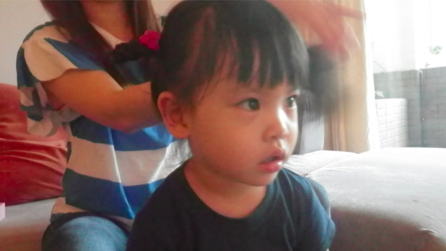 行く前にママに髪の毛をセットしてもらいます。