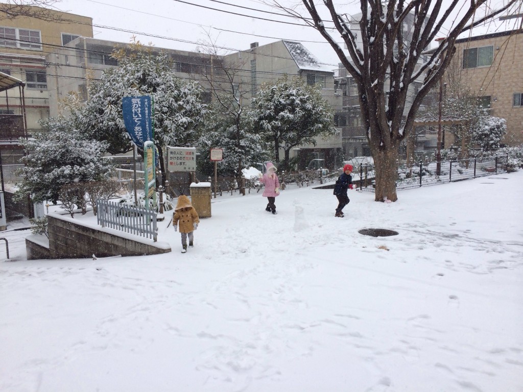 東京に戻ってきたら大雪。雪に大はしゃぎ。
